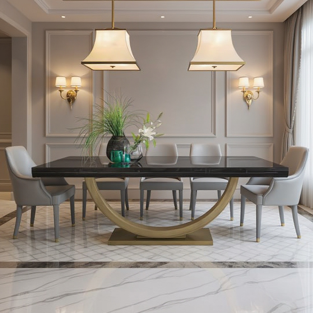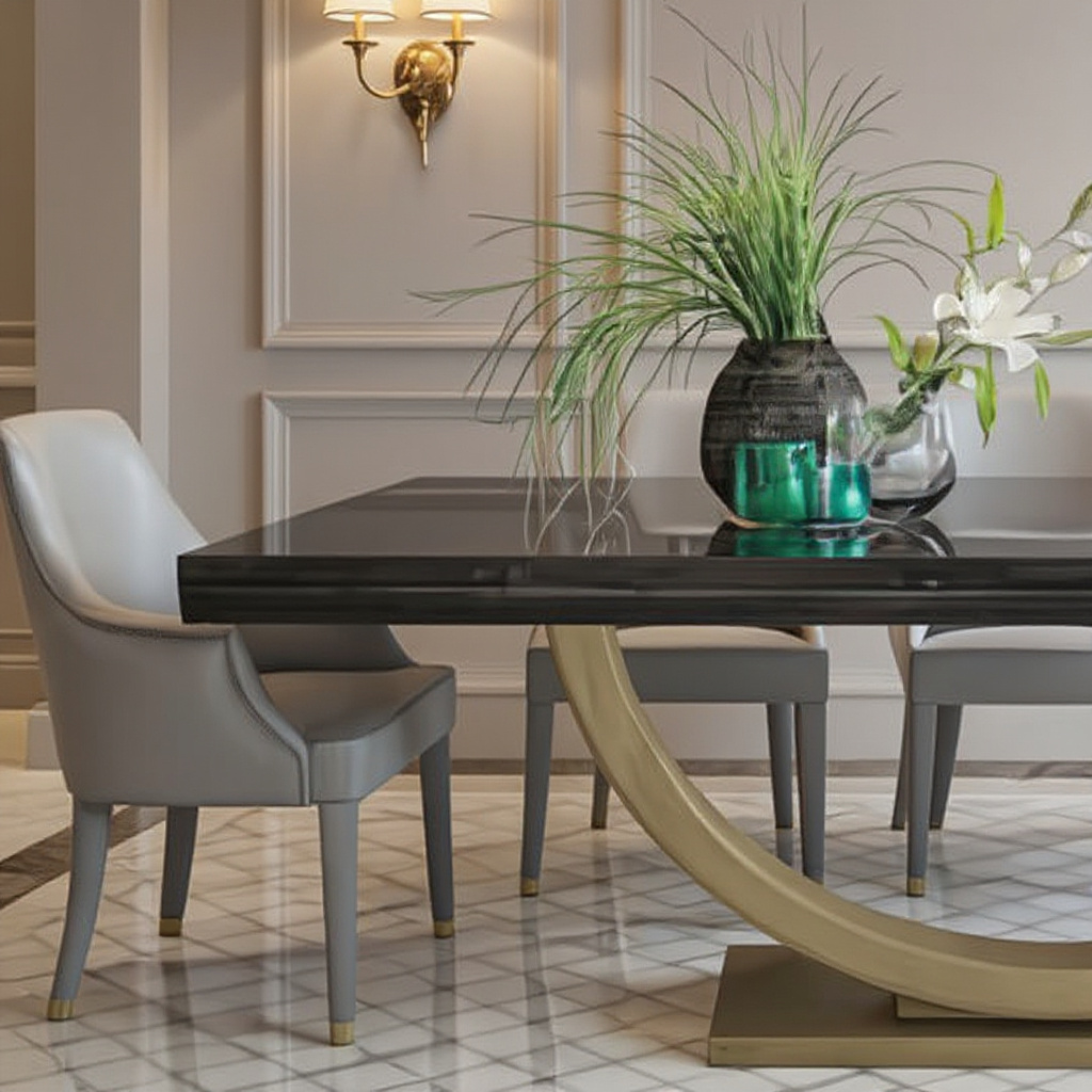supporting a glossy black tabletop, paired with sleek upholstered chairs for refined comfort.