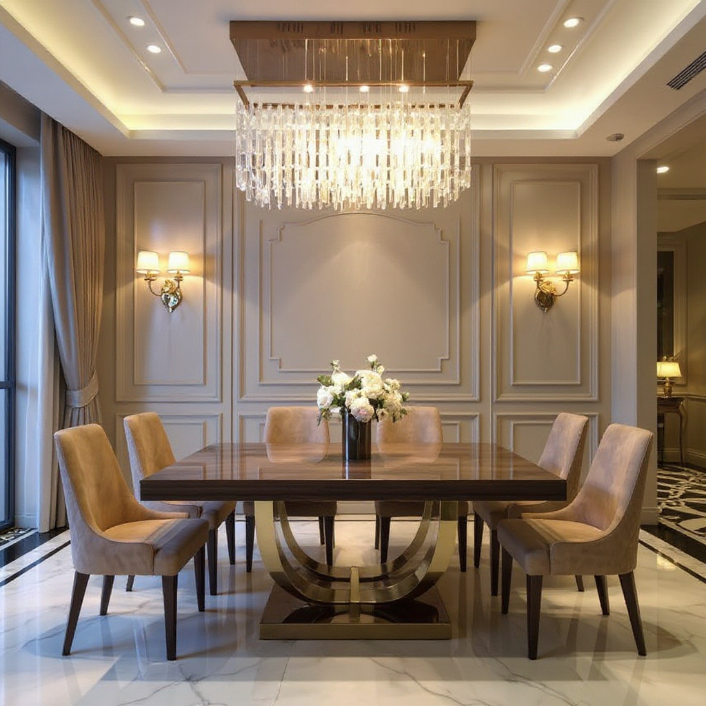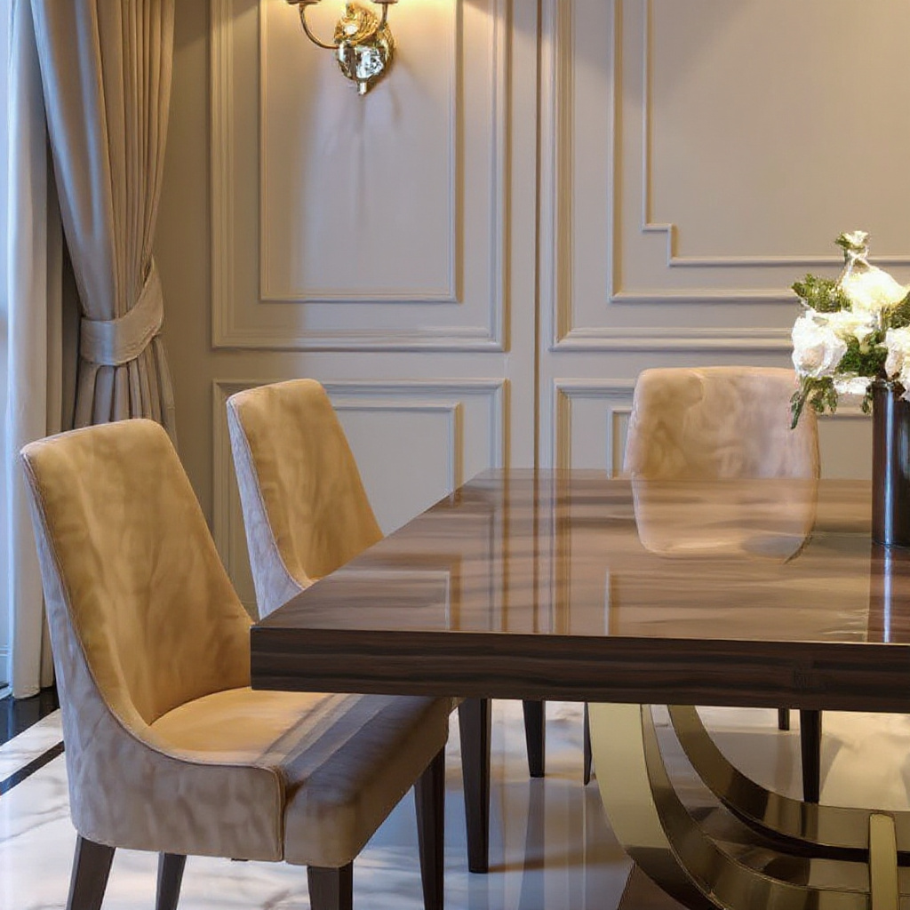 and plush velvet-finish chairs, this set blends modern luxury with soft eleganceโperfect for sophisticated, contemporary, and gracefully opulent interiors.
