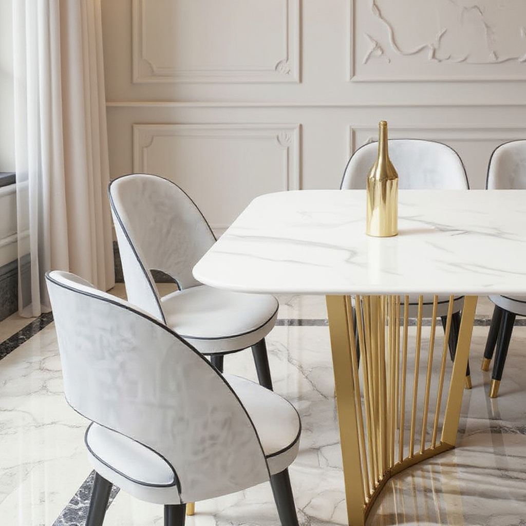 | Material | Marble-finish top, gold metal base, premium fabric chairs |