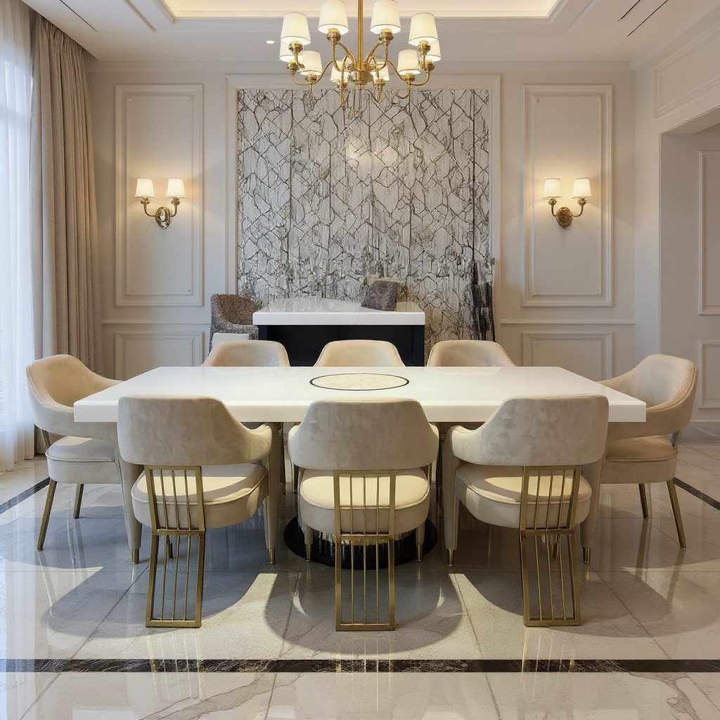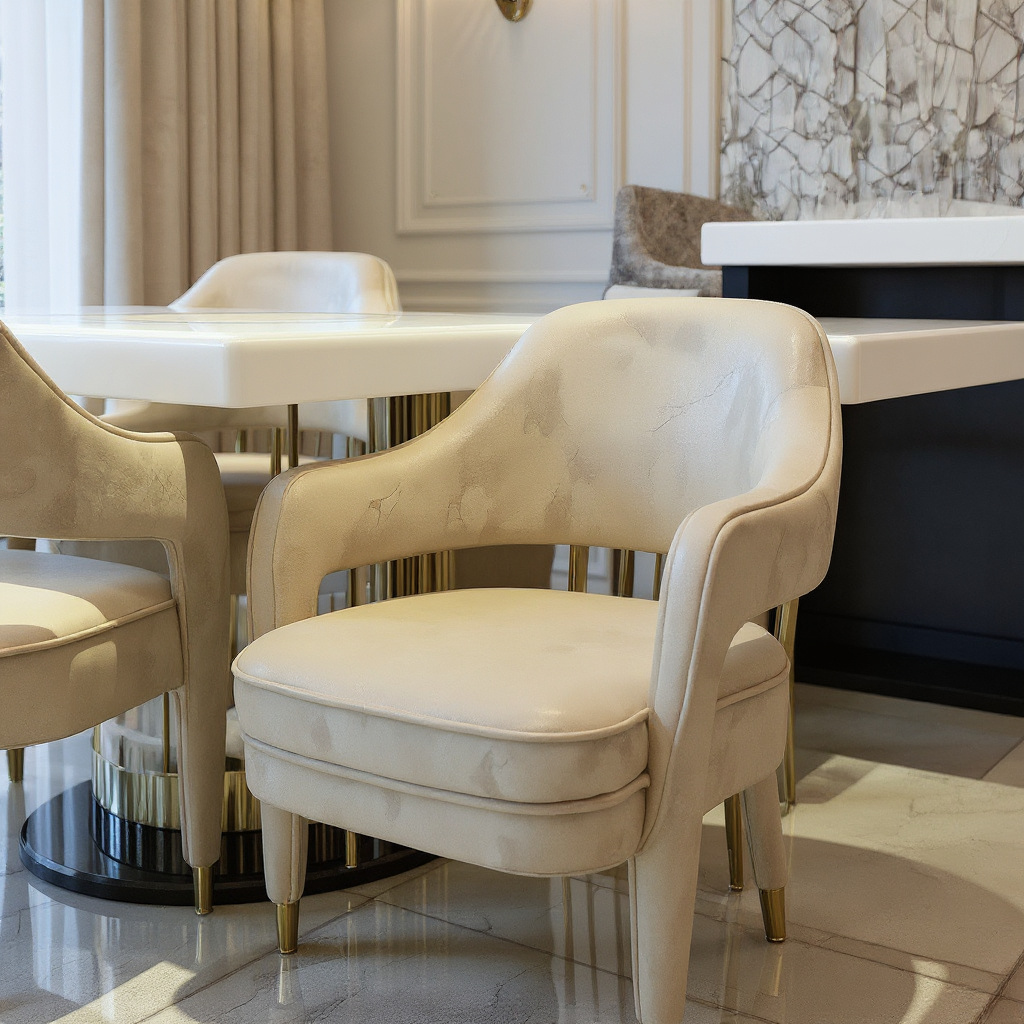 The Aurora Luxe Marble-White Dining Set elevates your dining space with its sleek white tabletop and plush velvet chairs accented by gold metal frames. Designed for modern luxury homes, it blends comfort, sophistication, and contemporary elegance for memorable dining experiences.