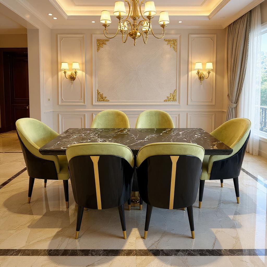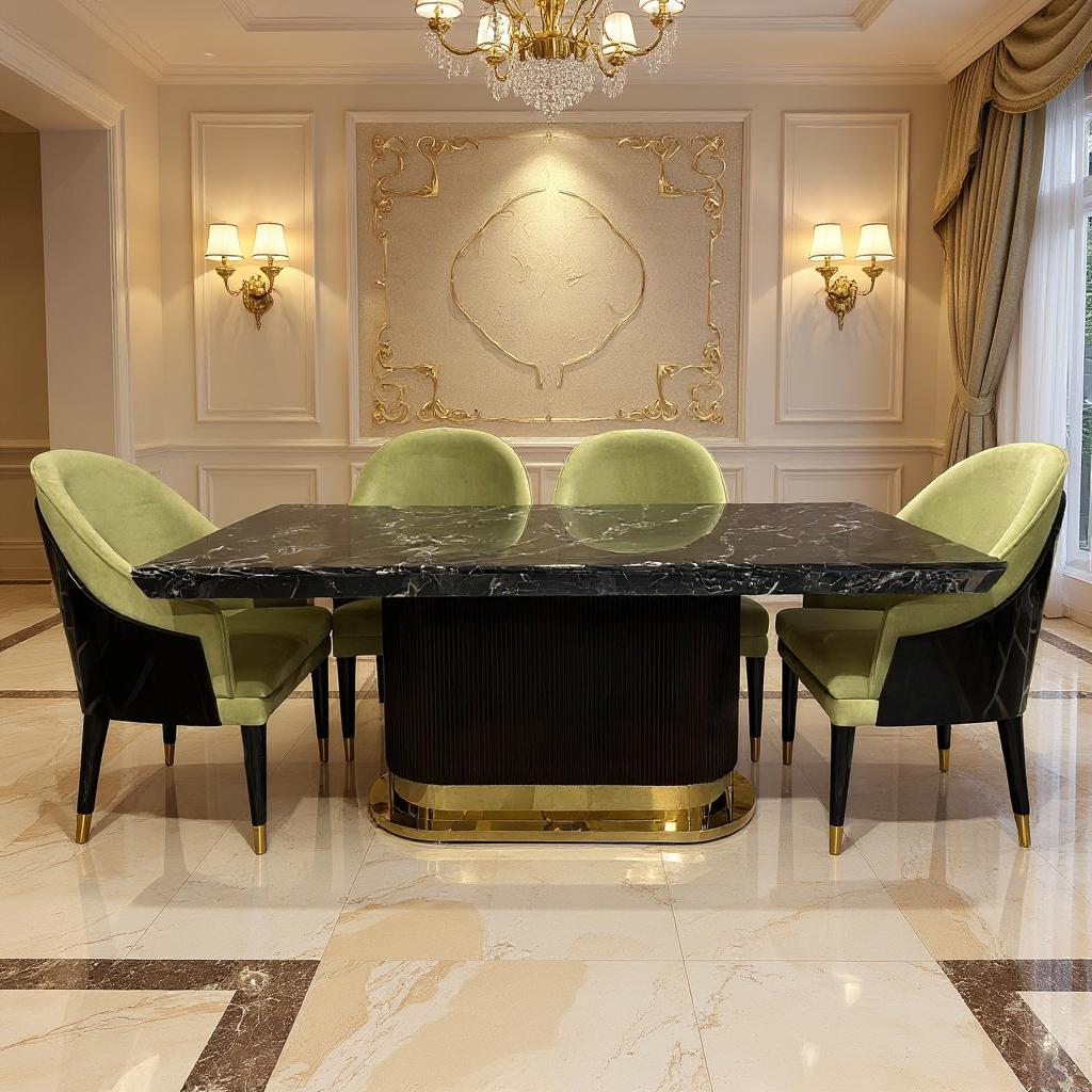 The Aurora Noir Luxury Dining Set features a striking black marble table paired with plush velvet chairs in soft sage tones.