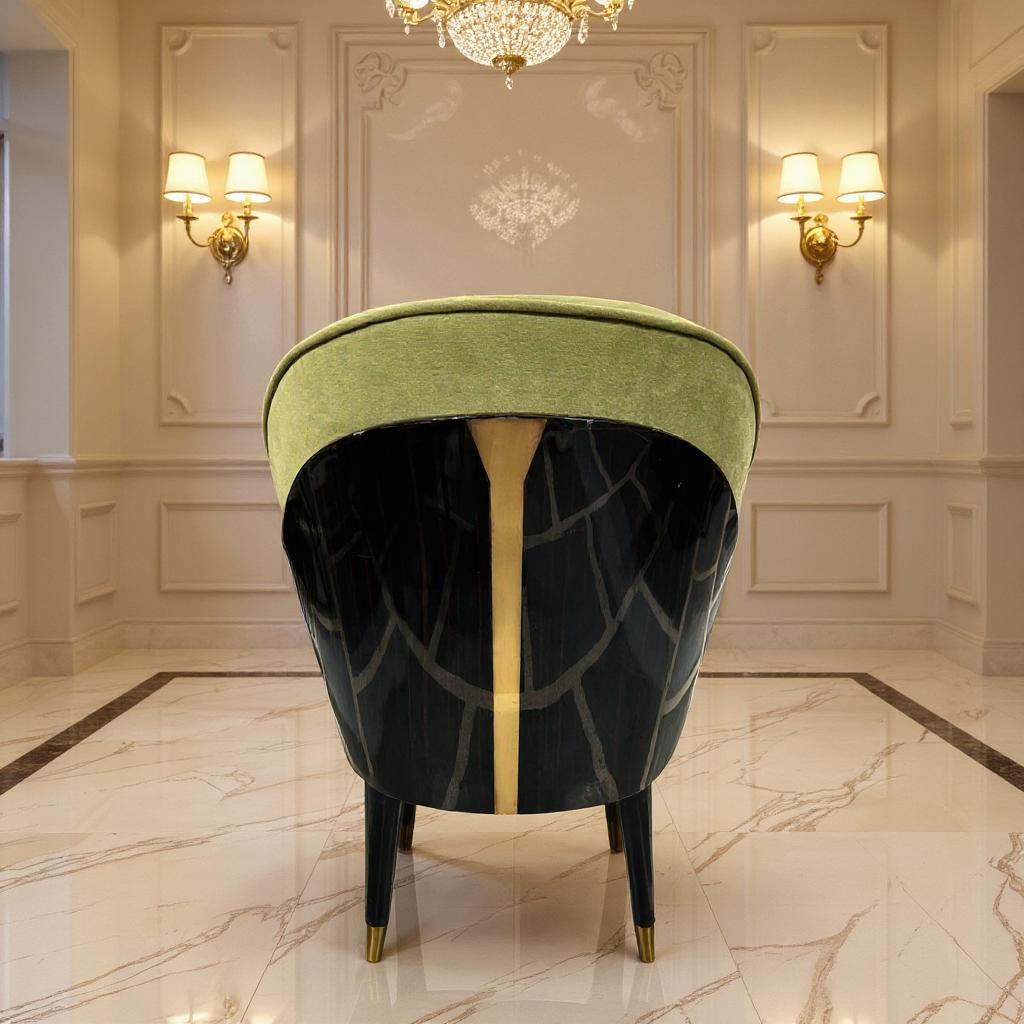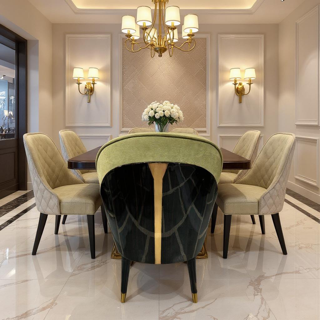 velvet chairs in soft sage tones. Accented with refined gold detailing, it creates a bold yet elegant