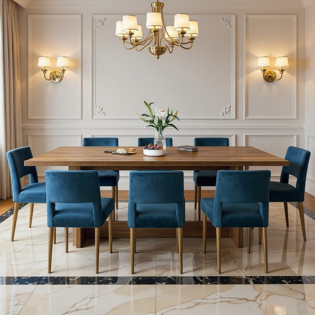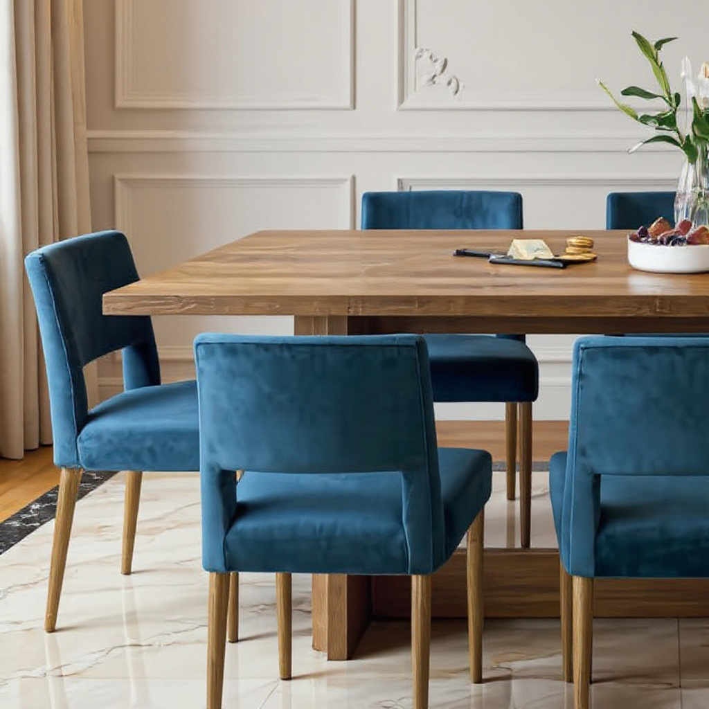 The Azure Oak Luxe Dining Set pairs a rich solid-wood table with plush velvet chairs in a striking deep-blue hue.