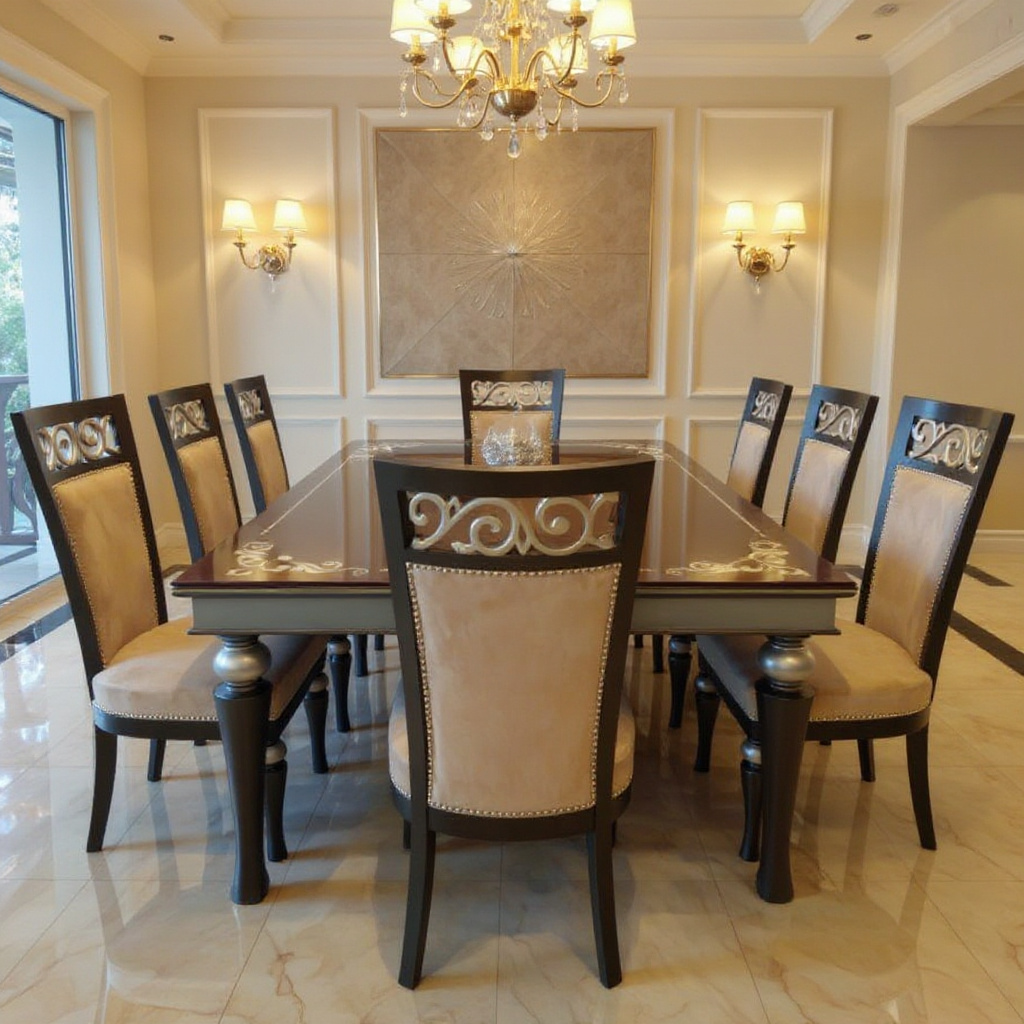 paired with high-back chairs adorned with metallic scroll detailing for a luxurious, contemporary appeal.