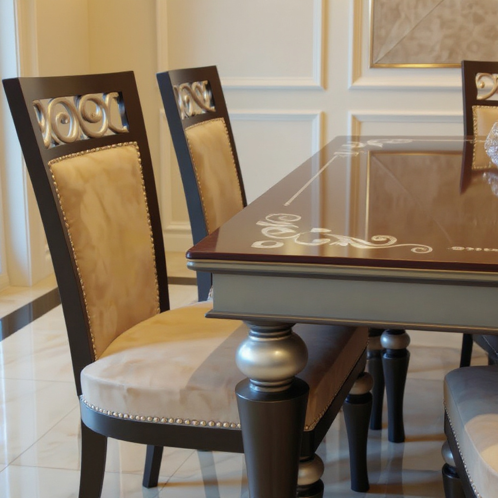 Design Intricate metallic scroll carvings on chair backs and tabletop borders