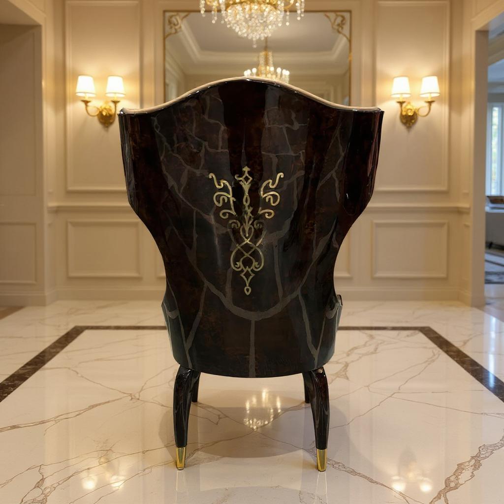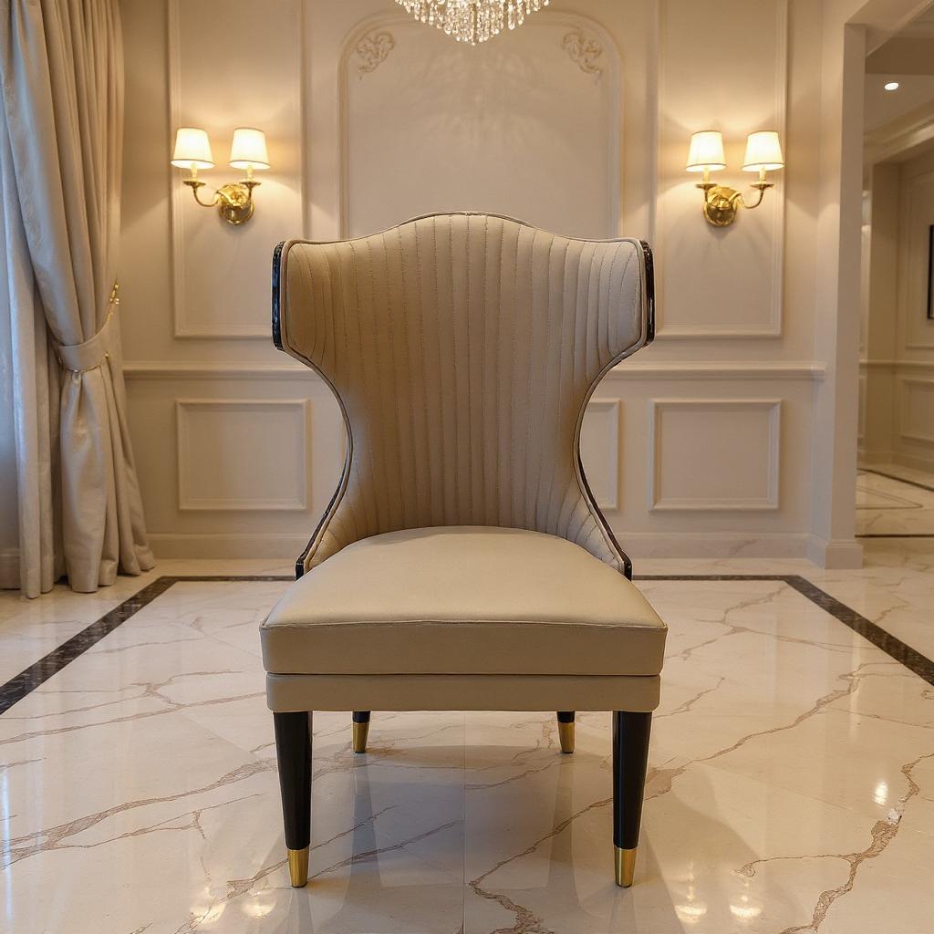 embroidered-back chairs. Its refined curves, premium upholstery, and luxurious detailing create a warm,