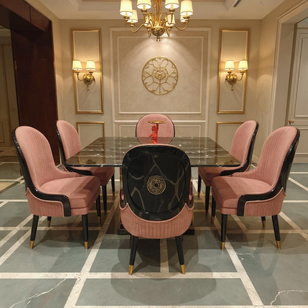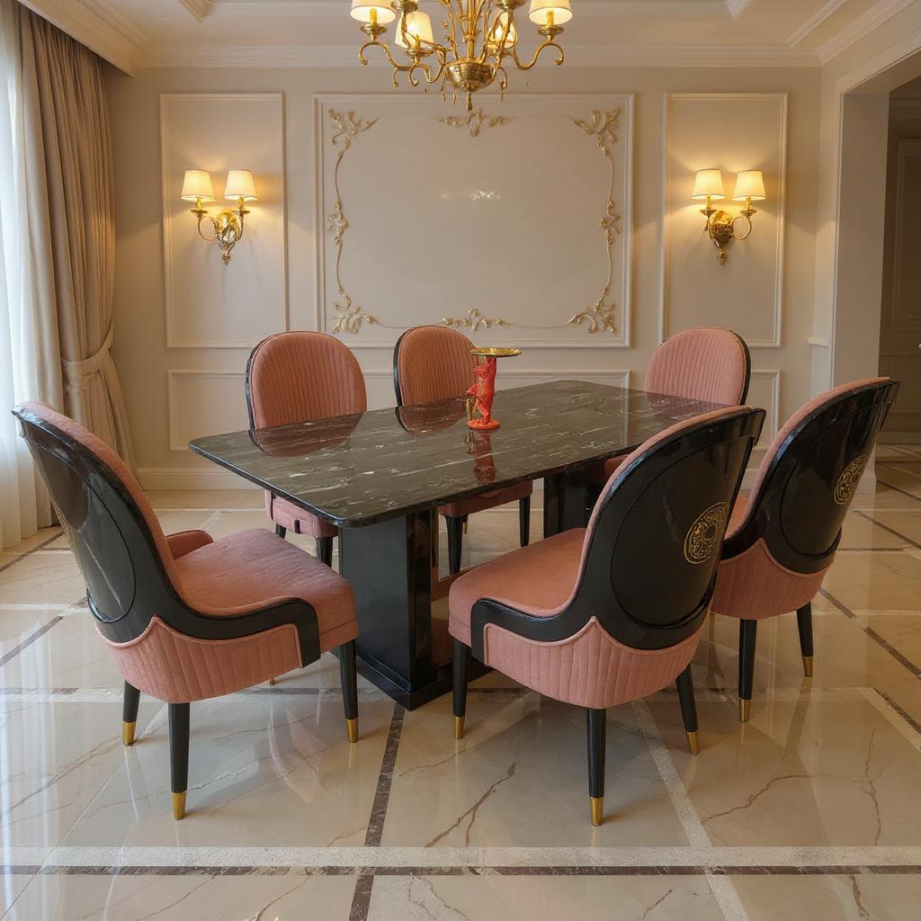 The Regal Noir Blush Dining Set elevates your dining space with a striking black marble table paired with plush blush-upholstered chairs