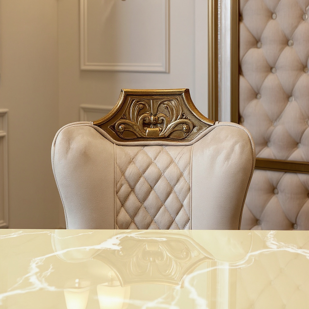 With its marble-finish tabletop, quilted high-back chairs, and ornate gold accents,
