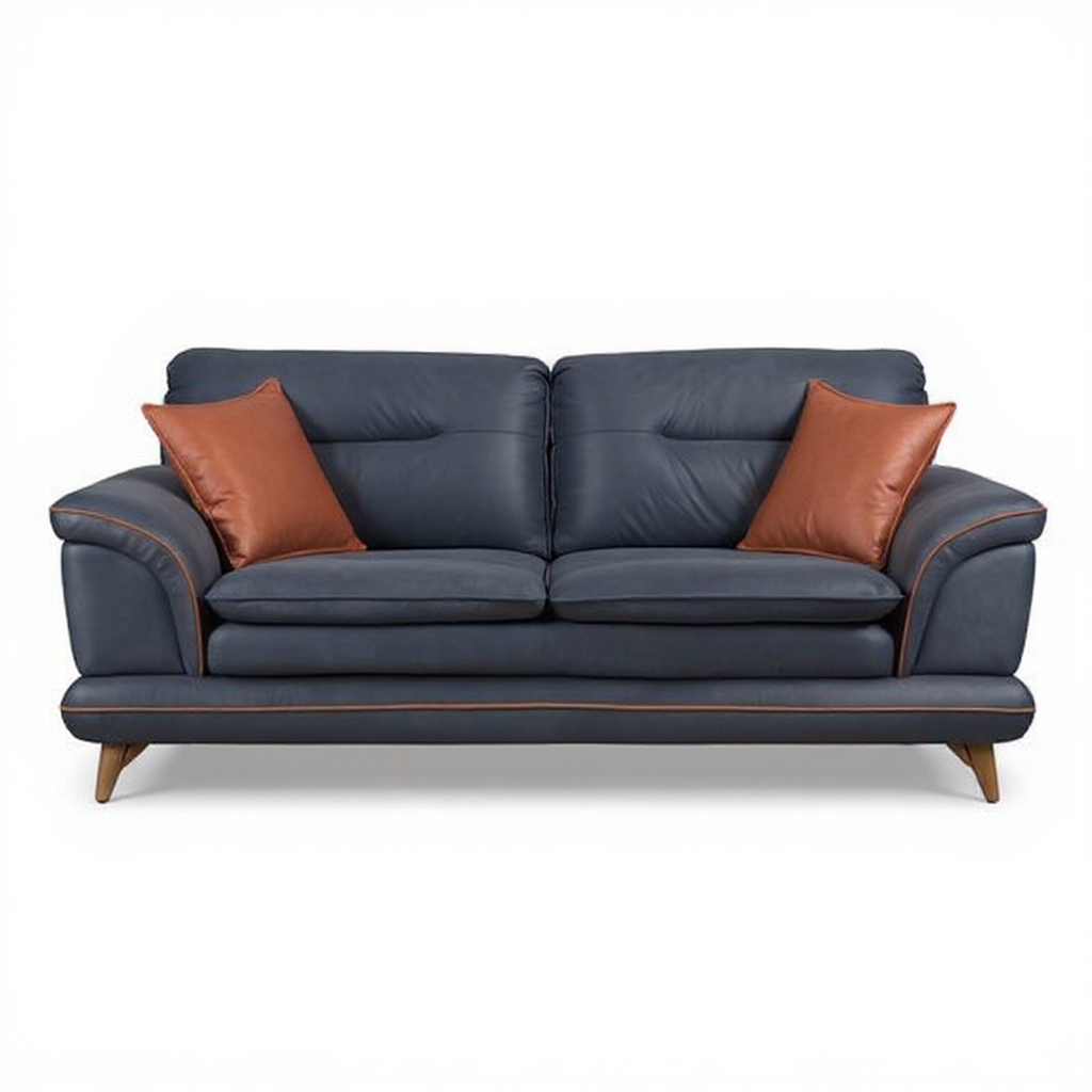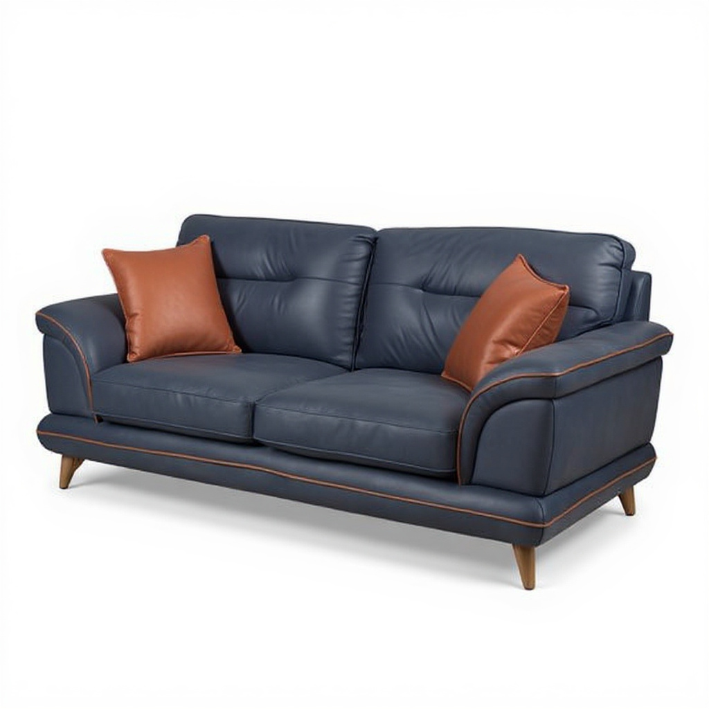 blue tone, accented with warm tan contrast piping and coordinated throw pillows. Smooth, softly contoured