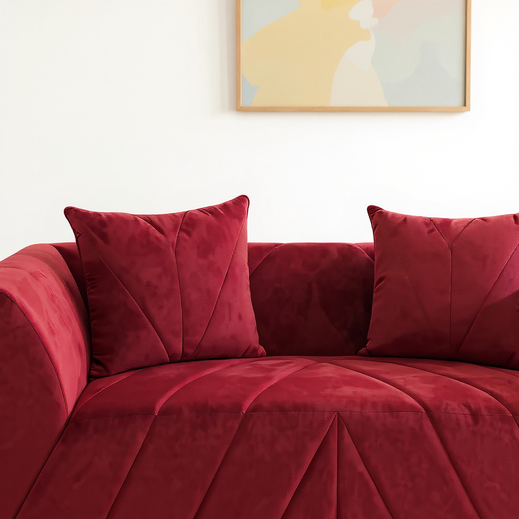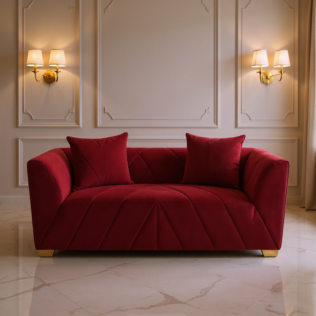 The Crimson Velvet Luxe Sofa adds a striking statement to your living room.