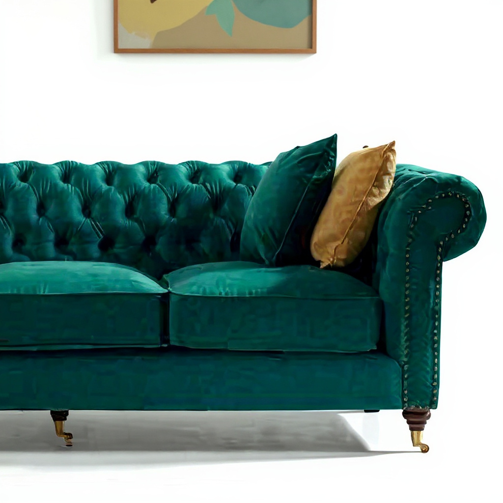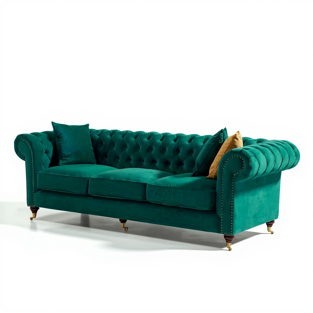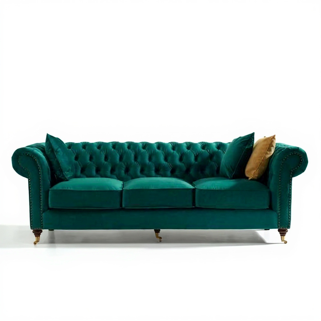 plush comfort, and modern refinement — the Regal Emerald Chesterfield Sofa.